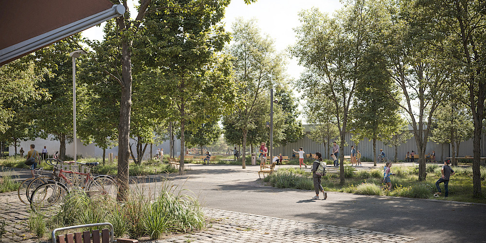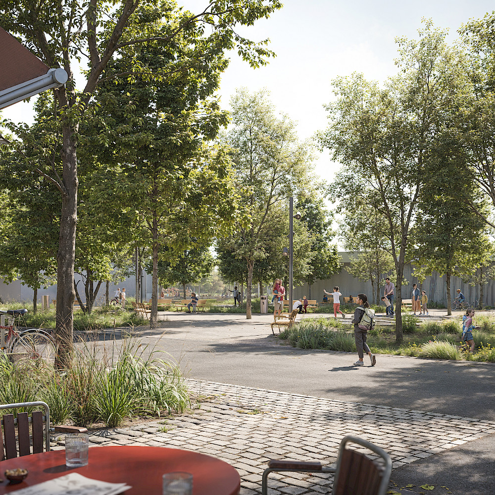 Herzstück des neuen Quartiers ist der Iris von Roten-Platz. Direkt an der neuen Primarschule gelegen, wird er als vielseitig nutzbarer öffentlicher Raum verstanden, der als Treffpunkt, Aufenthalts- und Begegnungsort fungiert. Charakteristisch sind unterschiedliche Oberflächenbeläge, die, ausgehend von den jeweiligen Nutzungsanforderungen, den Raum zonieren. Den mit schattenspendenden Bäumen gestalteten Platz, prägen neben Sitzelementen,Tischtennisplatten und einem Brunnen, begehbare Sickermulden. Diese grosszügigen, tiefer gelegenen und zum Teil üppig bepflanzten Grünflächen dienen neben dem Rückhalt von Regenwasser als Spielort und ökologisches Refugium.