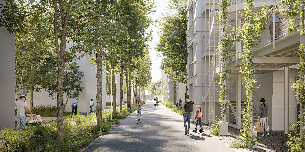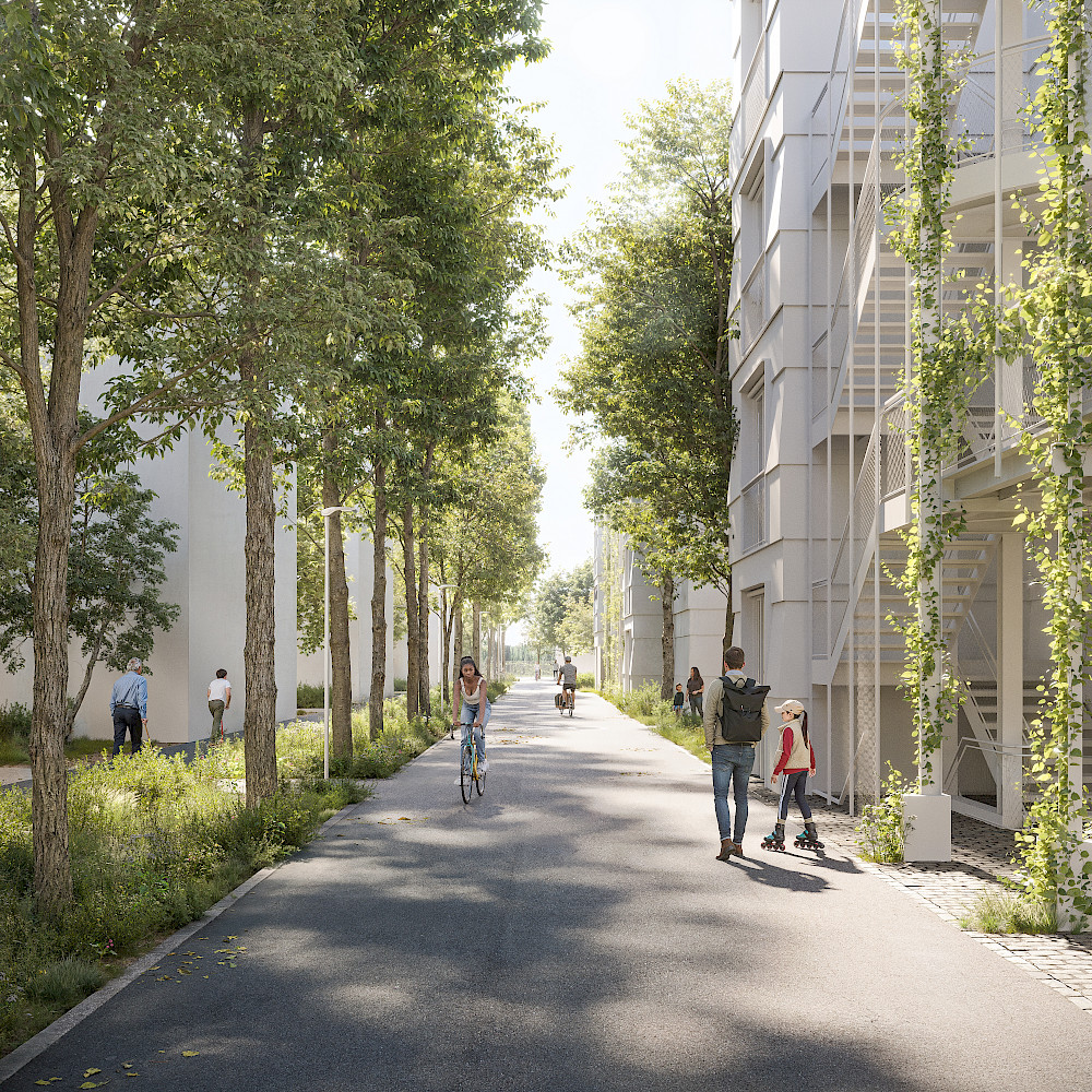 Der Standort ist hervorragend an den öffentlichen Verkehr angebunden; in unmittelbarer Gehdistanz befinden sich S-Bahn, Bus- und Tramhaltestellen. Demzufolge wird das Quartier autoarm entwickelt und als Begegnungszone geplant. Einzig die Katja Wulff-Anlage und der Irène Zurkinden-Platz sind arealseitig ausschliesslich über Fuss- und Velowege erschlossen. Für den motorisierten Individualverkehr (MIV) sind oberirdisch keine Parkplätze geplant; diese stehen Anwohnenden und Besuchern in einer vom Walkeweg aus angebundenen Tiefgarage zur Verfügung. Gestalterisch werden die Strassenräume à Niveau ausgebildet. Das anfallende Regenwasser wird nach dem Schwammstadtprinzip in begrünte, zum Teil baumbestandene Sickermulden und Grünflächen geführt.